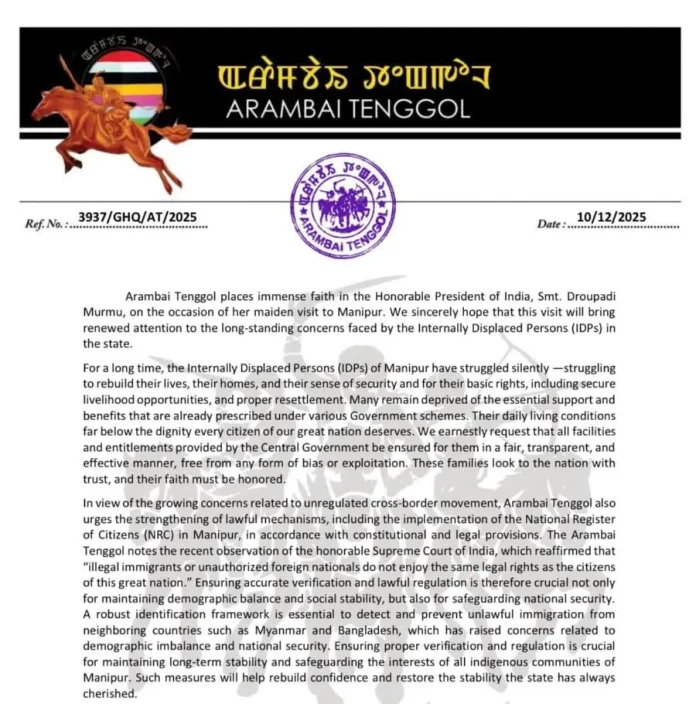 IMPHAL, Dec 11: Meitei organisation Arambai Tenggol (AT) has urged President Droupadi Murmu to address the plight of internally displaced persons as well as for the implementation of NRC.