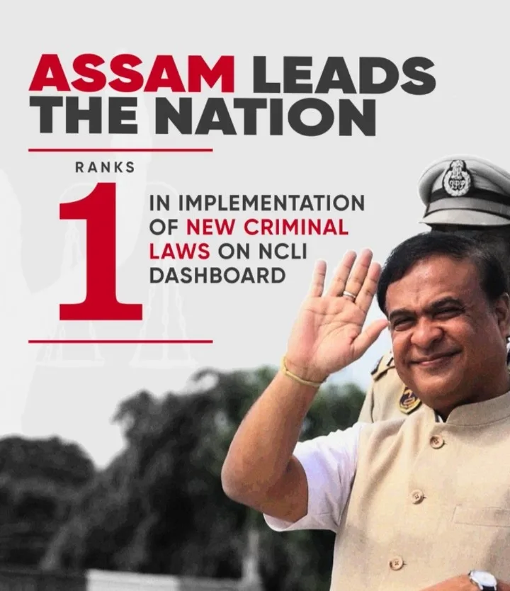 GUWAHATI, Nov 20: Assam has emerged as the top-performing state in the country in the implementation of the New Criminal Laws, Chief Minister Himanta Biswa Sarma announced on Wednesday. Backed by a score of 72.03, significantly higher than the national average of 44.96, the state has been lauded for its administrative efficiency, reforms, and strong integration of digital systems.