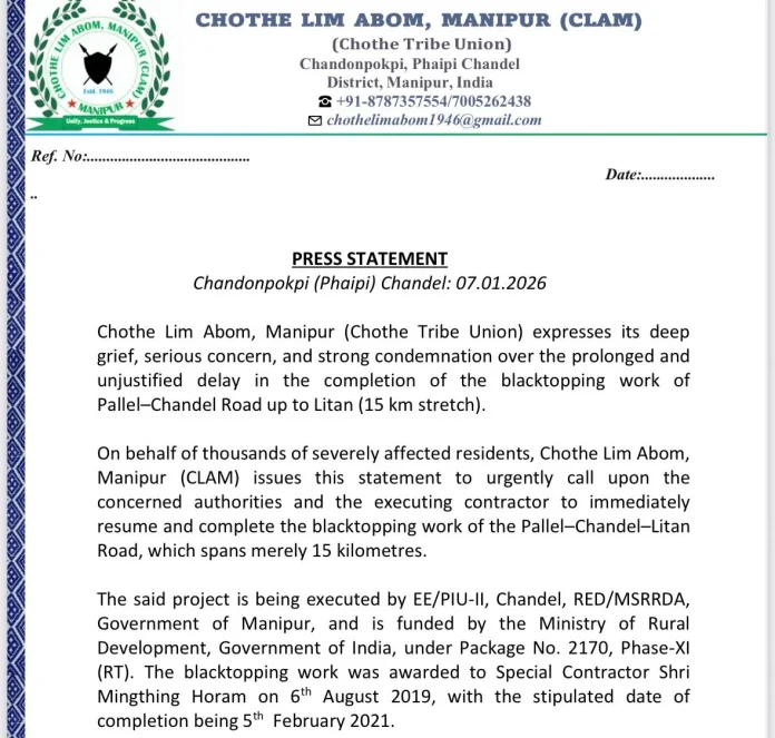 CHANDEL, Jan 8: The Chothe Lim Abom, Manipur (Chothe Tribe Union) expressed deep grief, serious concern and strong condemnation over the prolonged delay in completing the black‑topping of the Pallel–Chandel–Litan road (15 km). According to a statement issued by the union, the group, on behalf of thousands of severely affected residents, urged the authorities and the executing contractor to immediately resume and finish the work.