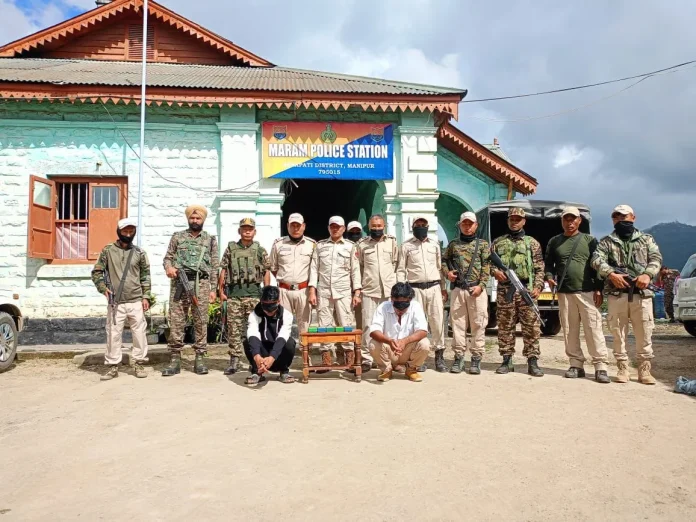 During the operation, a red WagonR car bearing registration number DL-8-CP-7014 was found moving suspiciously. The vehicle was stopped for checking, and upon frisking, the car was found to be driven by one M. Leoshiru (26), son of Moses, a resident of TNK village, Senapati district. He was accompanied by Thaongao (28), son of Rubin, from Phaibung Khunou village, also of Senapati district.
