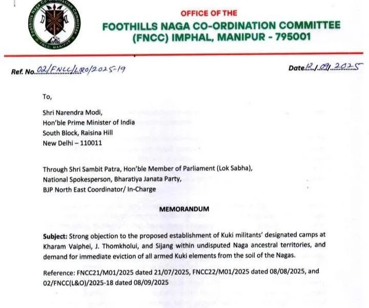 Imphal, September 12: The Foothills Naga Co-ordination Committee (FNCC) has submitted a memorandum to Prime Minister Narendra Modi through BJP MP and national spokesperson Dr. Sambit Patra, voicing strong opposition to the demand for a separate administration in Manipur and raising concerns over the presence of Kuki militant groups in Naga ancestral lands.