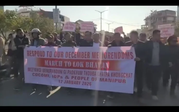 IMPHAL, Jan 12: Hundreds of internally displaced persons and members of Coordinating Committee on Manipur Integrity held a protest rally in Imphal demanding response from govenor Ajay Kumar Bhalla on resettlement of displaced persons.