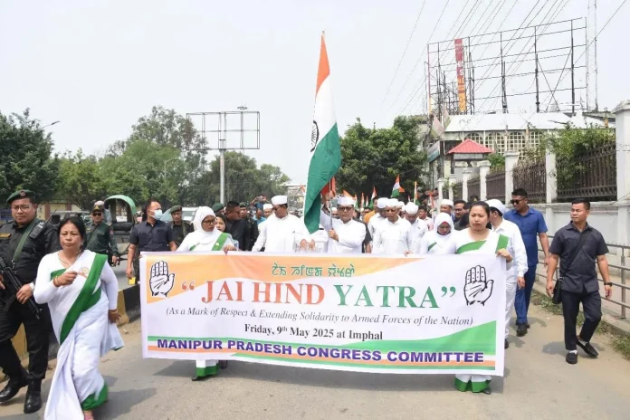 IMPHAL, May 9: In a powerful display of patriotism and unity, the Manipur Pradesh Congress Committee (MPCC) today organized a ‘Jai Hind Yatra’ in Imphal to express unwavering solidarity with the Indian Armed Forces and to support the ongoing Operation Sindoor.