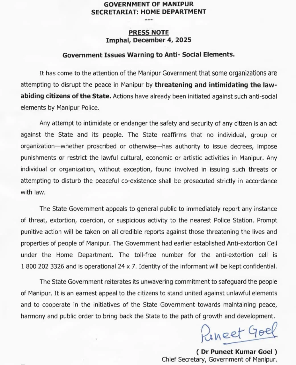 The state government also appealed to the general public to immediately report any instance of threat, extortion, coercion, or suspicious activity to the nearest police station, and that prompt punitive action will be taken on all credible reports against those threatening the lives and properties of the people of Manipur.
