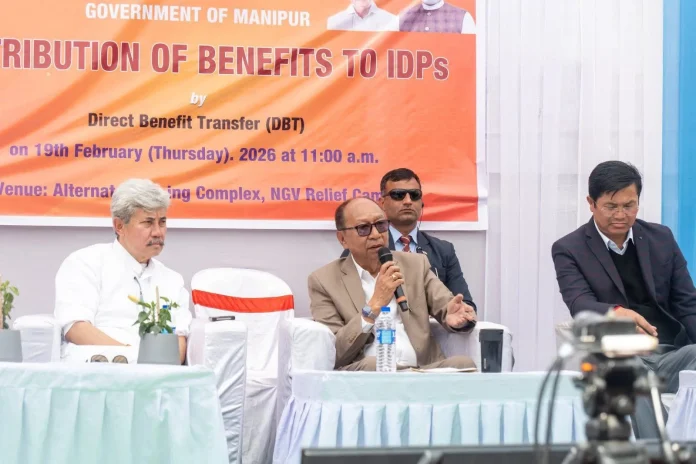 The interaction was held in a hybrid format during the Distribution of Benefits to IDPs through Direct Benefit Transfer (DBT) programme at the Alternate Housing Complex, National Games Village (NGV) Relief Camp in Imphal West. Around ₹33 crore was released to displaced families as part of the initiative.