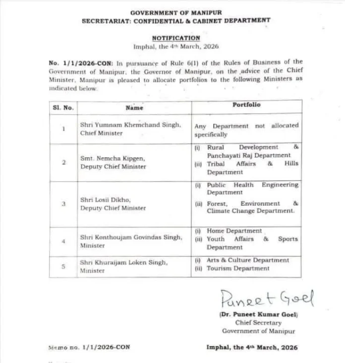 An official statement said “in pursuance of Rule 6(1) of the Rules of Business of the Government of Manipur, the Governor of Manipur, on the advice of the Chief Minister, Manipur is pleased to allocate portfolios to the following ministers.”