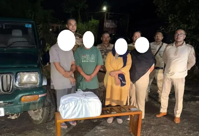 The arrests were made at Wabagai Lamkhai Thongkha area under Kakching Police Station, where security forces intercepted the group and recovered 91 soap cases containing 1.12 kg of heroin powder. A Bolero vehicle, five mobile phones, and two Aadhaar cards were also confiscated.