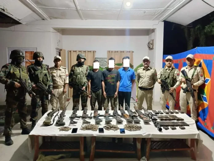 Imphal, September 17: Surity Forces and Manipur Police launched multiple successful operations across the state on Tuesday, apprehending cadres from different banned outfits and seizing a large cache of arms, ammunition, and incriminating materials.