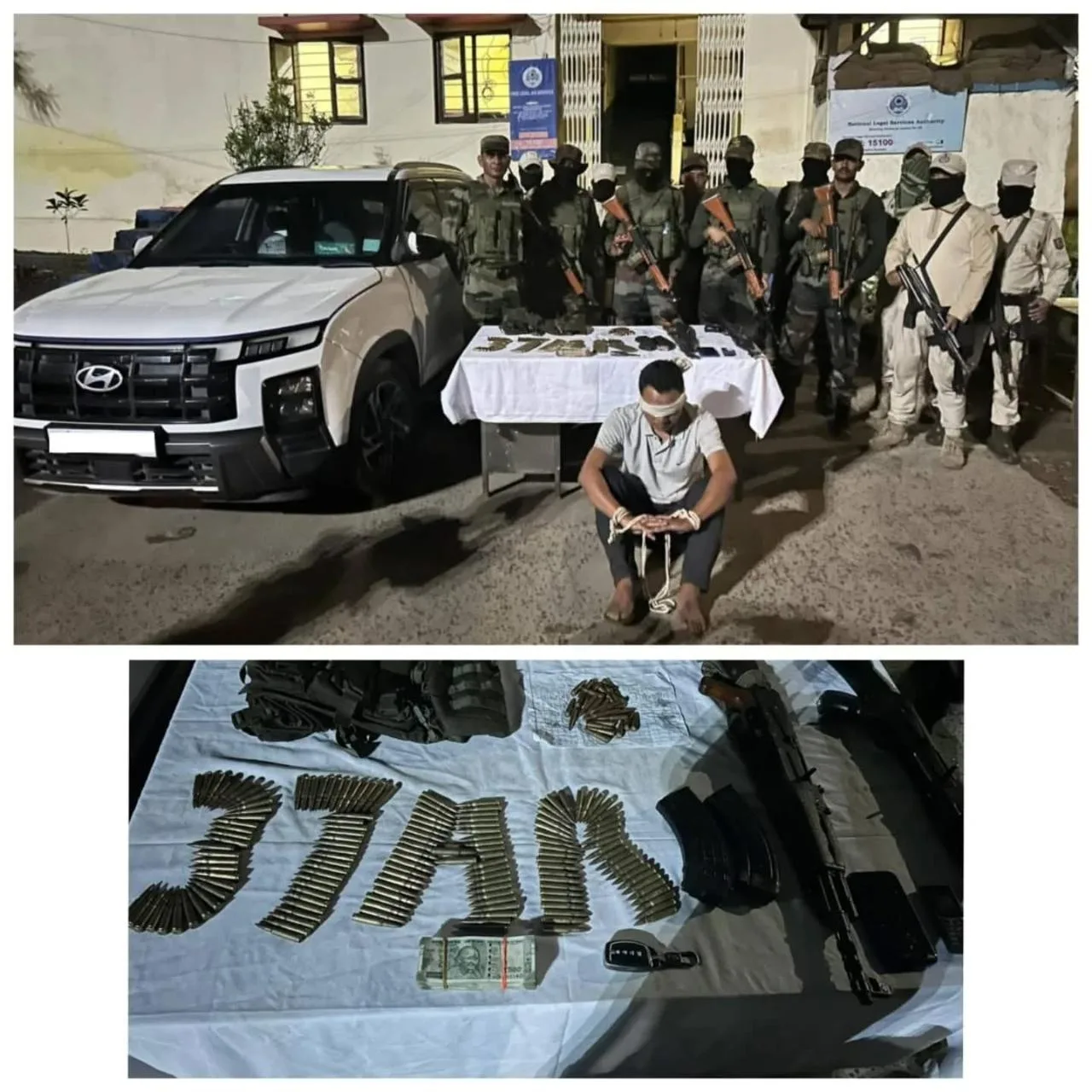 From his possession, forces recovered two AK-47 rifles with magazines, 31 rounds of 7.62mm ammunition, 150 rounds of 7.62 SLR/LMG ammunition, a bulletproof pouch, ₹1 lakh in cash, two mobile phones, and a Hyundai Creta (Regd. No. 24 BH 0676B).