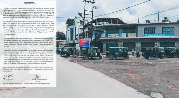 Imphal, September 18 (NNN): Makhan Kanglatongbi Naga Forum (MKNF) and Tangkhul Welfare Association Kanglatongbi (TWAK) have stated today that the Naga community in the Makhan-Kanglatongbi has taken strong exceptions to the “brutal assault on an innocent Tangkhul Naga auto driver, Mr. Kingson Kashung, a resident of Chingshou village of Kamjong district presently residing in Kanglatongbi, on the evening of September 17”. At around 7:30 pm, while Kashung was providing his services to two Liangmai women who had hired his auto to collect vegetables from Motbung Bazar, an unfortunate incident unfolded, TWAK and MKNF said in a joint statement today.