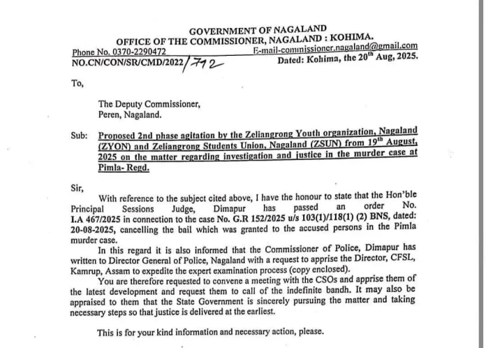 Kohima, August 21: The Nagaland Government has urged the Zeliangrong Youth Organisation, Nagaland (ZYON), and the Zeliangrong Students’ Union, Nagaland (ZSUN), to call off their indefinite agitation in Peren district, assuring that the State is taking “active measures” to deliver justice in the Pimla murder case.