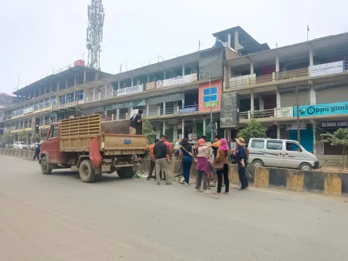Senapati, October 26: The Senapati Entrepreneurs Association (SEA) on Saturday carried out a cleanliness drive to remove thick layers of dust accumulated along the road dividers in the main bazar area of Senapati town. The initiative aimed to improve the town’s air quality and overall hygiene, which had been affected by heavy vehicular movement stirring up dust and causing inconvenience to pedestrians and shopkeepers.