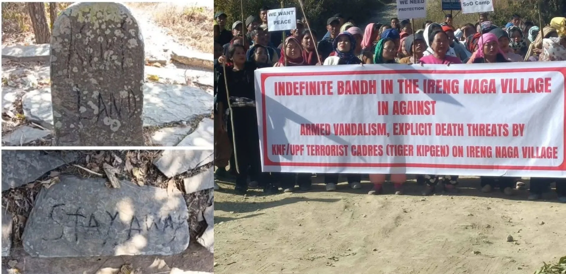 According to reports, the incident occurred on Sunday night when miscreants allegedly affiliated with the Suspension of Operations (SoO) group Kuki National Front–President (KNF-P) dismantled the village’s entry gate and defaced a memorial stone by writing slogans such as “Kukiland” and “Stay Away.” A vehicle waiting shed at the village gate, along with chairs kept there, was also vandalised.